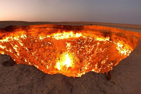 Кратер появился в 1971 году на месте скопления природного газа, которое обнаружили советские геологи. Пробурив скважину, они вызвали обвал – верхние слои почвы обвалились в подземную пещеру, открыв большую дыру, наполненную газом. Геологи решили поджечь газ, полагая, что со временем огонь погаснет. Но кратер горит до сих пор. Его диаметр составляет 60 метров, глубина – около 20 метров. Столбы пламени могут достигать 15 метров в высоту.