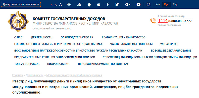 На сайте Комитета государственных доходов (КГД) Министерства финансов Казахстана размещен аналог российского списка «иноагентов» — «Реестр лиц, получающих деньги или иное имущество от иностранных государств, международных и иностранных организаций, иностранцев, лиц без гражданства, подлежащих опубликованию».