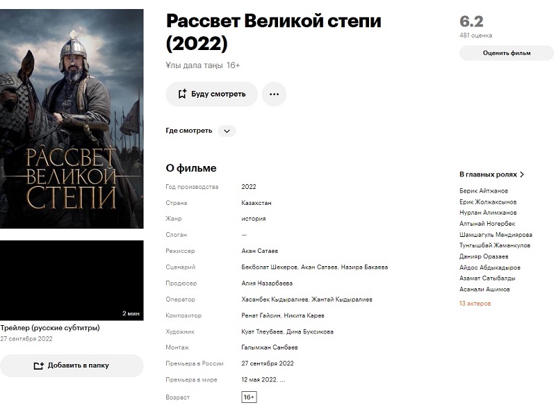 На сайте Кинопоиска указано, что продюсером картины «Улы Дала Таны» («Рассвет Великой степи»), вышедшей в 2022 году, была младшая дочь бывшего президента Казахстана Алия Назарбаева.