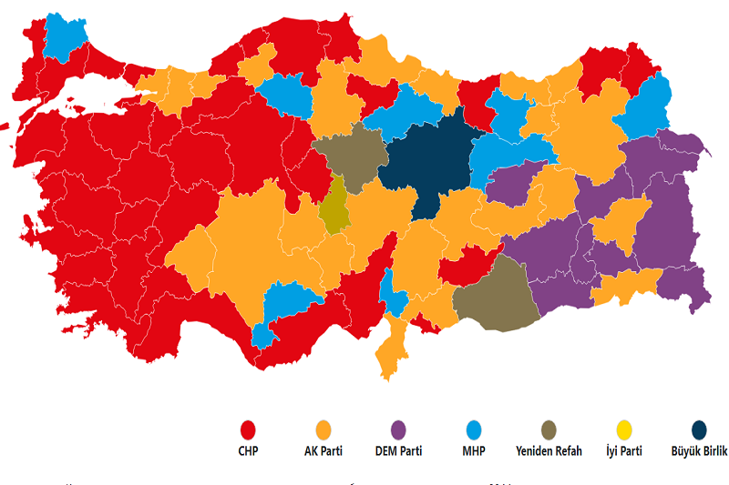 В общей сложности ПСР побеждает в 35 метрополиях и городах, в том числе в Адане, Измире, Манисе, Анталье. За кандидатов от оппозиционной партии проголосовали почти во всей западной части Турции. Среди 24 регионов, где праздновала победу правящая партия, — Конья, Эрзурум, Трабзон, Ризе, Хатай, а также Газиантеп, где в прошлом году произошло разрушительное землетрясение.