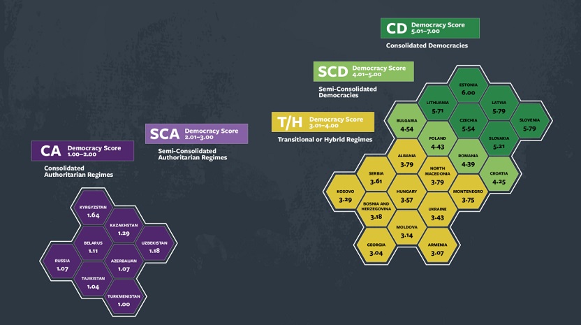 На вершине списка — страны Балтии, Чехия, Словакия и Словения. Уровень демократии в этих государствах оценивается в диапазоне от 5,20 до 6 баллов из 7 возможных.