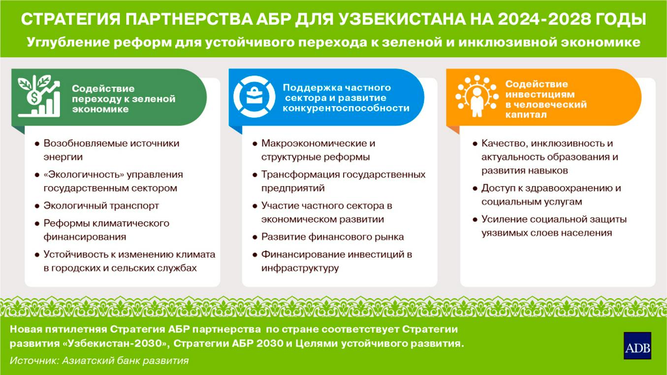 Пятилетняя стратегия предусматривает поддержку реформ по преобразованию экономики Узбекистана в «зеленую» и инклюзивную. АБР будет тесно сотрудничать с правительством республики в развитии и повышении конкурентоспособности частного сектора, а также в поддержке стимулирования инвестиций в человеческий капитал.