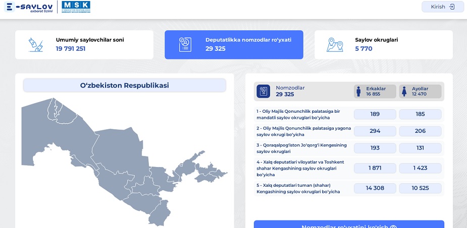 В частности, через сайт можно ознакомиться со всеми кандидатами в депутаты Законодательной палаты Олий Мажлиса (парламента) республики, а также в местные Кенгаши (советы).