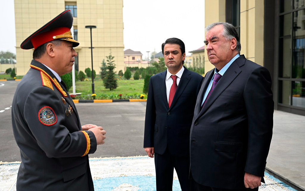 Эмомали Рахмон и его сын Рустам Эмомали на открытии госучреждения по подготовке высококвалифицированных военных кадров в Душанбе. Фото пресс-службы президента Таджикистана