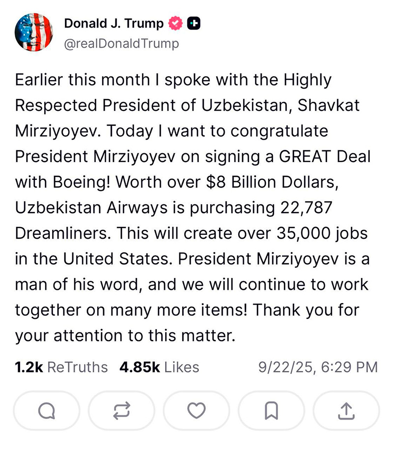 По сообщениям пресс-службы президента Узбекистана, 22 сентября в Нью-Йорке у Мирзиёева был насыщенный день. Он провел ряд встреч с представителями американского бизнеса и международных финансовых институтов. В частности, плодотворно прошли переговоры с президентом компании Boeing Global Брэнданом Нэльсоном. Стороны отметили важность своевременной реализации подписанных в ходе нынешнего визита узбекского лидера в Штаты документов: нового контракта на поставку самолетов и соглашения о долгосрочном сотрудничестве.