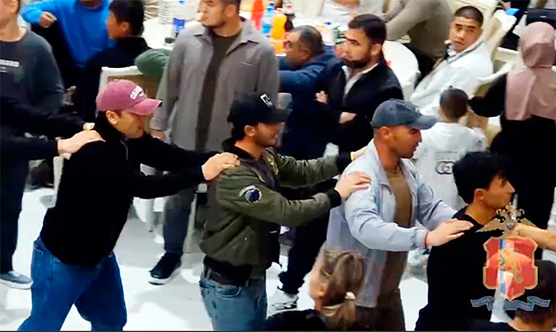 Судя по видеоролику, опубликованному ГУ МВД, в зале было немало женщин и детей. Сотрудники Росгвардии проводили проверку документов и обыски посетителей банкетного зала, задействуя в этой процедуре служебных собак. Также запечатлено, как группа мужчин была выстроена в плотную шеренгу и затем под надзором представителей силовых структур выведена из зала. Несколько человек завели в автозак, заломив им руки.