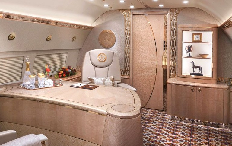 Тогда уточнялось, что один из «боингов» был превращен в воздушное судно премиум-класса. На его борту есть VIP-спальня, приватная ванная комната с душевой кабиной и биде, выполненный по спецзаказу письменный стол и массажное кресло. Для отделки салона использовались дорогие материалы, включая позолоченные детали. Повсюду установлены мониторы и сенсорные дисплеи.