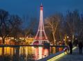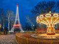 Самый крупный и яркий объект - макет Эйфелевой башни рядом с французской каруселью