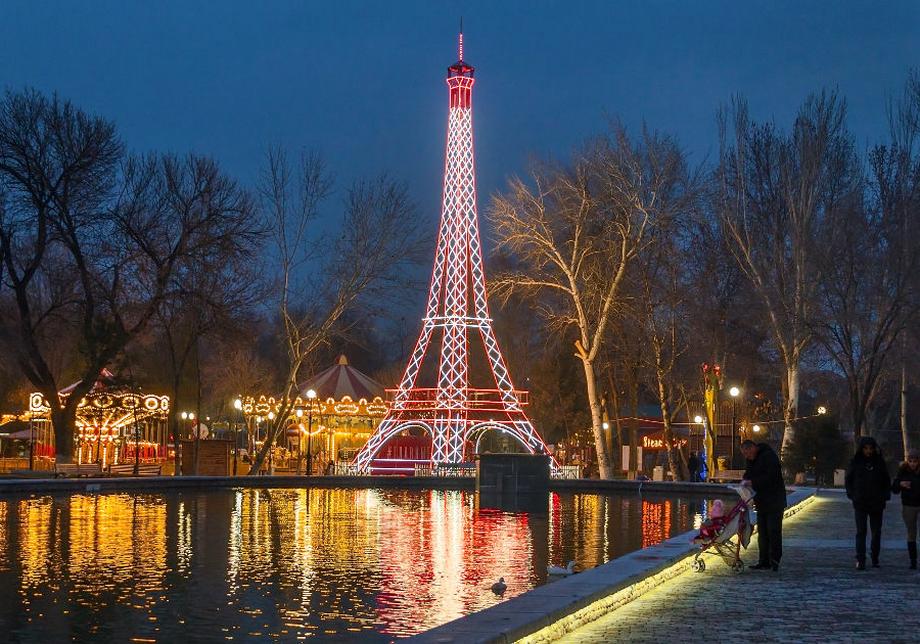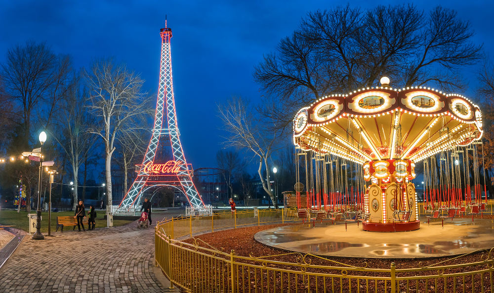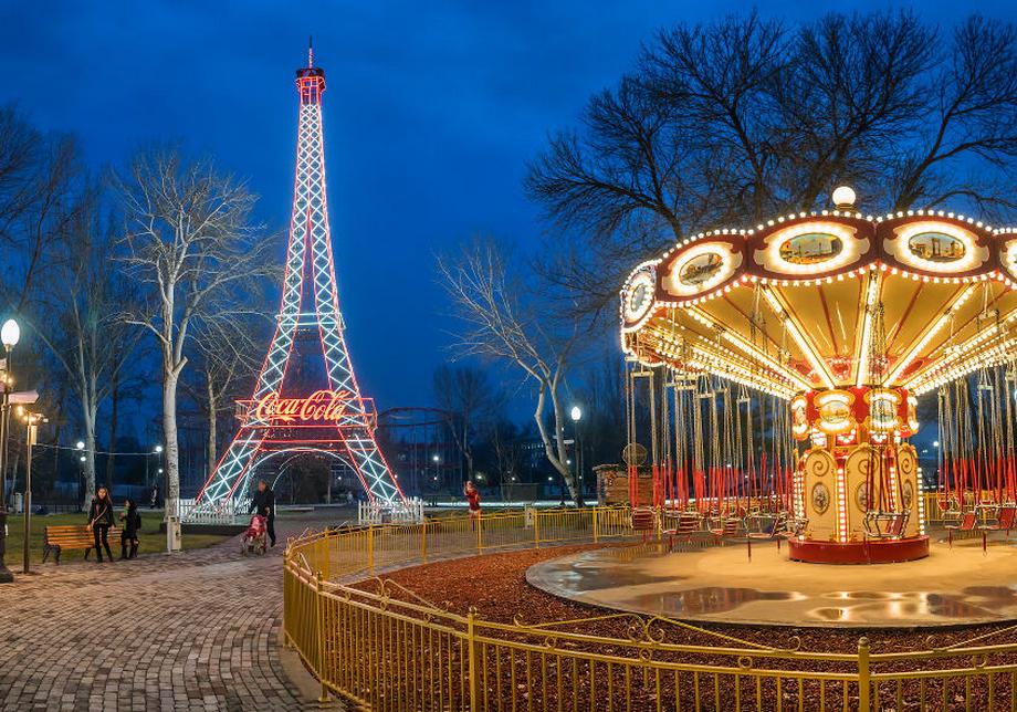 Самый крупный и яркий объект - макет Эйфелевой башни рядом с французской каруселью