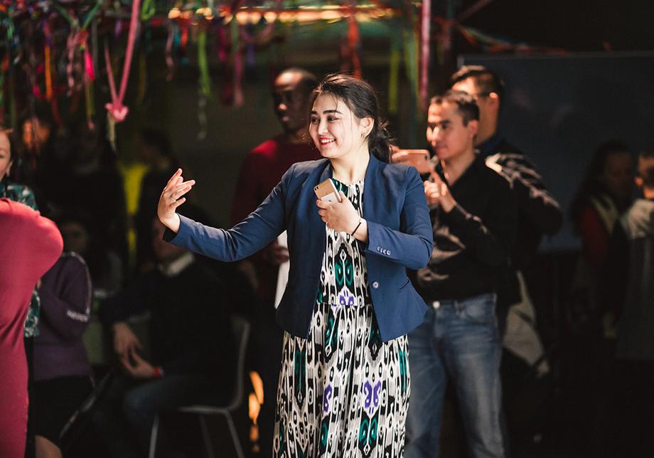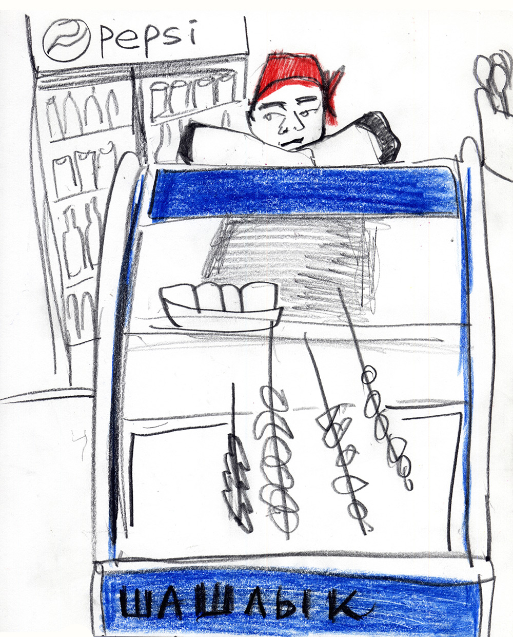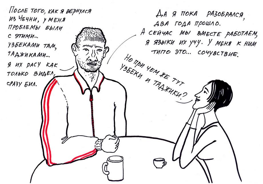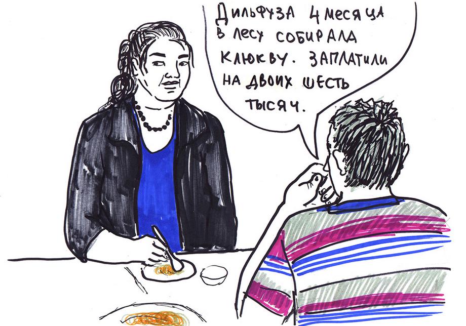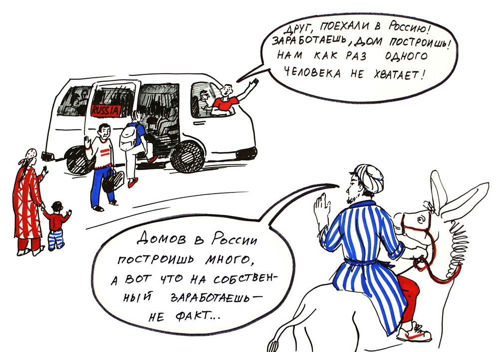 Пятый выпуск «Насреддина в России» будет посвящен мигрантам, которые пытаются строить две карьеры: одну — для заработка, а вторую — творческую. Именно такие герои и пришли на чаепитие в музей «Гараж»: получивший в России «Золотую маску» памирский артист Абдумамад Бекмамадов, который работает на стройке; юрист и по совместительству переводчик газеты на узбекский язык Зарнигор Омониллаева; художница из Киргизии Бермет Борубаева, которая перепробовала в Москве самые разные специальности, и Чынгыз Айдаров из Бишкека, который работает грузчиком, а в перерывах рисует своих коллег и Москву.