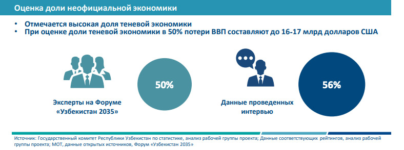 И предприниматели, и эксперты оценивают долю теневой экономики от 50-56%. Инфографика: из Концепции стратегии долгосрочного развития Узбекистана до 2035 года