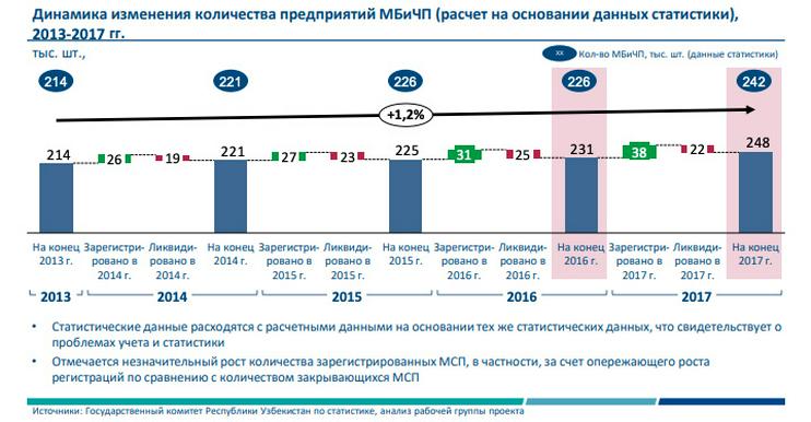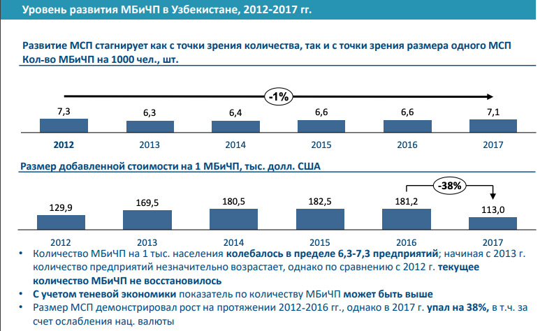 Судя по данным, которые приводятся в Концепции стратегии развития Узбекистана, количество предприятий малого бизнеса и частного предпринимательства стагнирует: в 2017 году таких предприятий примерно столько же, сколько в 2012-м (на 1000 человек). Однако по сравнению с 2016 годом их количество выросло.