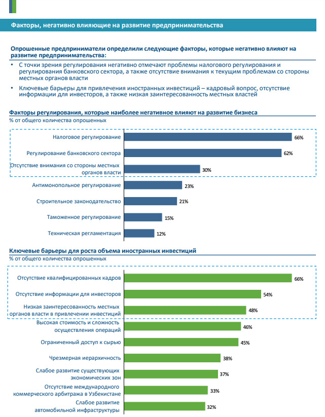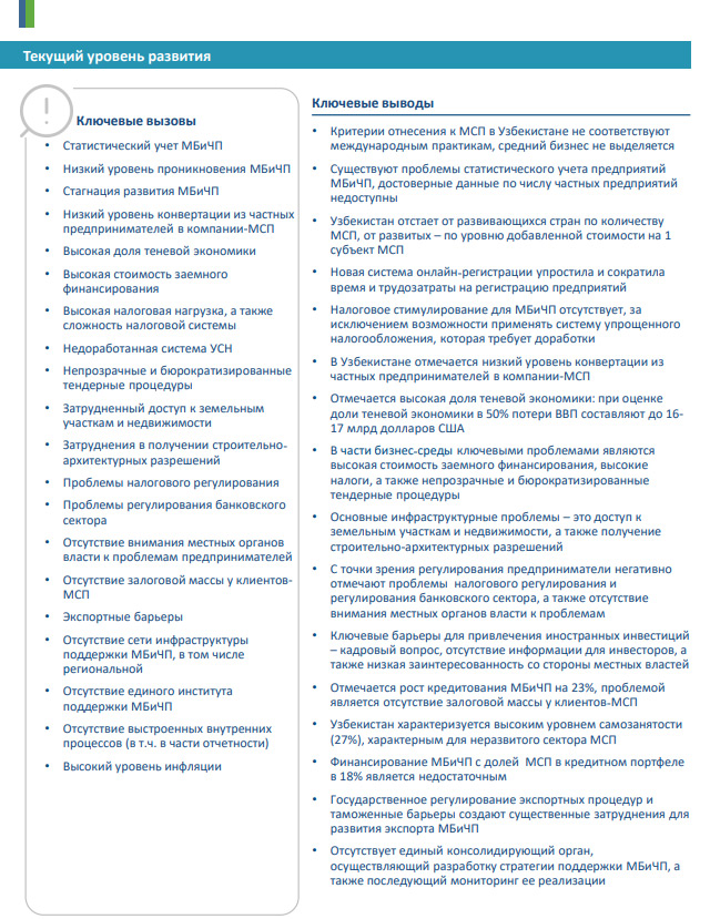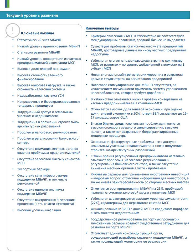 В таблице — ключевые проблемы развития малого и среднего бизнеса, обозначенные в стратегии: стагнация, теневая экономика, высокий уровень инфляции, затрудненный доступ к земельным участкам и недвижимости, проблемы с налогами. Среди главных выводов, к которым пришли авторы концепции, — в Узбекистане нет достоверных сведений о количестве частных предприятий, отсутствует налоговое стимулирование, ключевые барьеры для иностранных инвесторов — кадровый вопрос, отсутствие информации и низкая заинтересованность местных властей; таможенные барьеры и государственное регулирование экспорта создают существенные затруднения для развития экспорта малого бизнеса и частных предприятий.