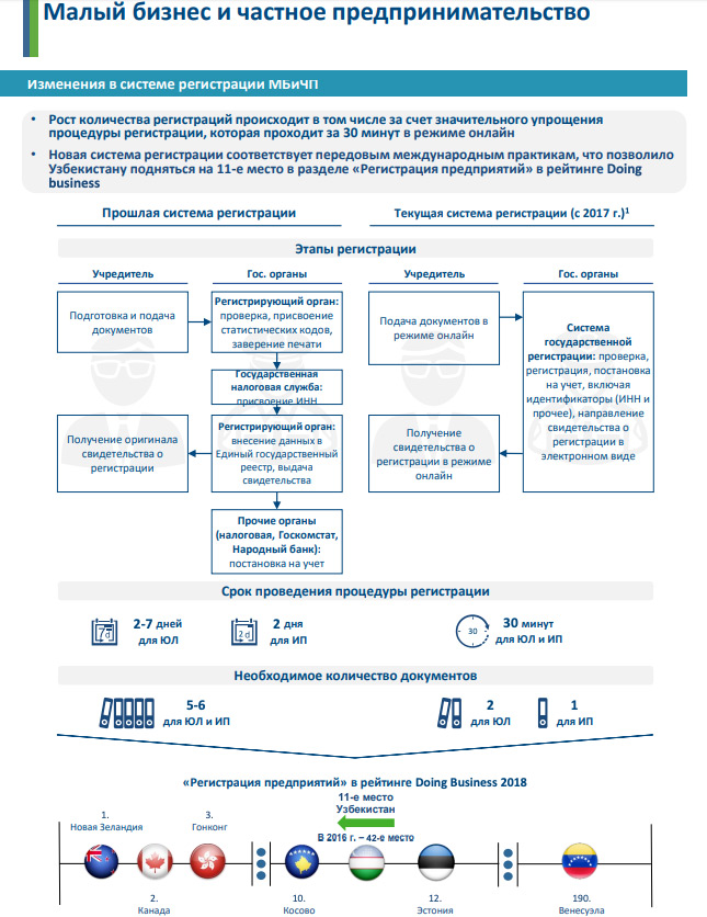 Есть и хорошие новости: Узбекистан перешел с 42-го (в 2016-м) на 11-е (в 2018-м) место в одной из позиций рейтинга Doing Business: теперь на регистрацию предприятия уходит примерно полчаса.