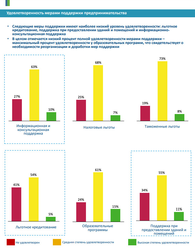 Из разговоров с предпринимателями видно, что меньше всего они удовлетворены условиями льготного кредитования, поддержкой при предоставлении зданий и помещений и информационной и консультационной помощью государства.