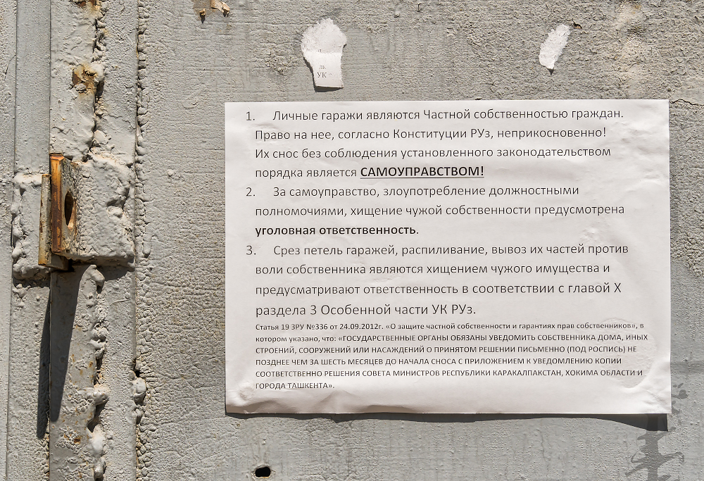 В начале июня на воротах многих частных гаражей внутри жилых кварталов Чиланзарского района Ташкента были расклеены уведомления с круглой печатью от гаражного управления при хокимияте (районной администрации) с требованием добровольного сноса. «Уважаемый владелец гаража, гаражное управление просит Вас убрать гараж на основании договора на временное занятие места под гараж, п.2.2 владелец обязуется снести гараж по первому требованию Хокимията или ГУП «Чиланзар Авто хизмат» (гаражное управление). В целях исполнения Решения хокима г.Ташкента от 01.07.2017 года Вам необходимо произвести демонтаж гаража и освободить место от 10.06.19 до 13.06.19. В случае воспрепятствования исполнению решения Хокима города Ташкента и не исполнения требования в срок, гараж будет срезан комиссионно. ДУК «Чиланзар Авто хизмат, ул. Бунедкор 50» (орфография и синтаксис сохранены. – Прим. «Ферганы»).
