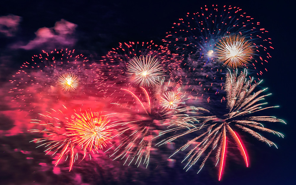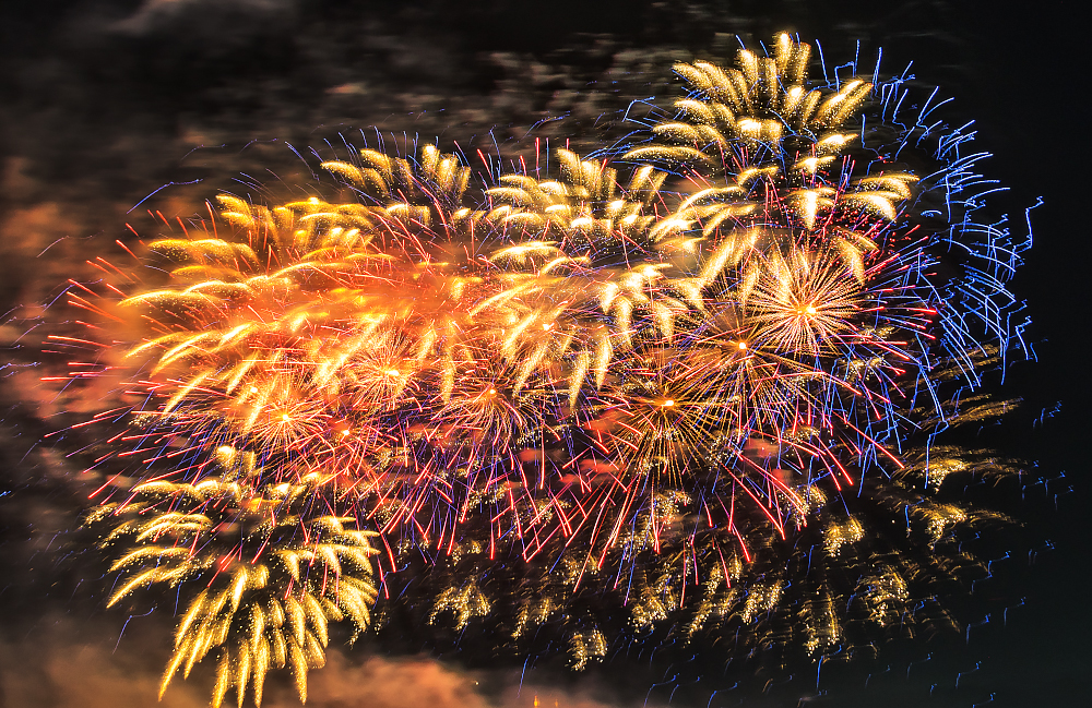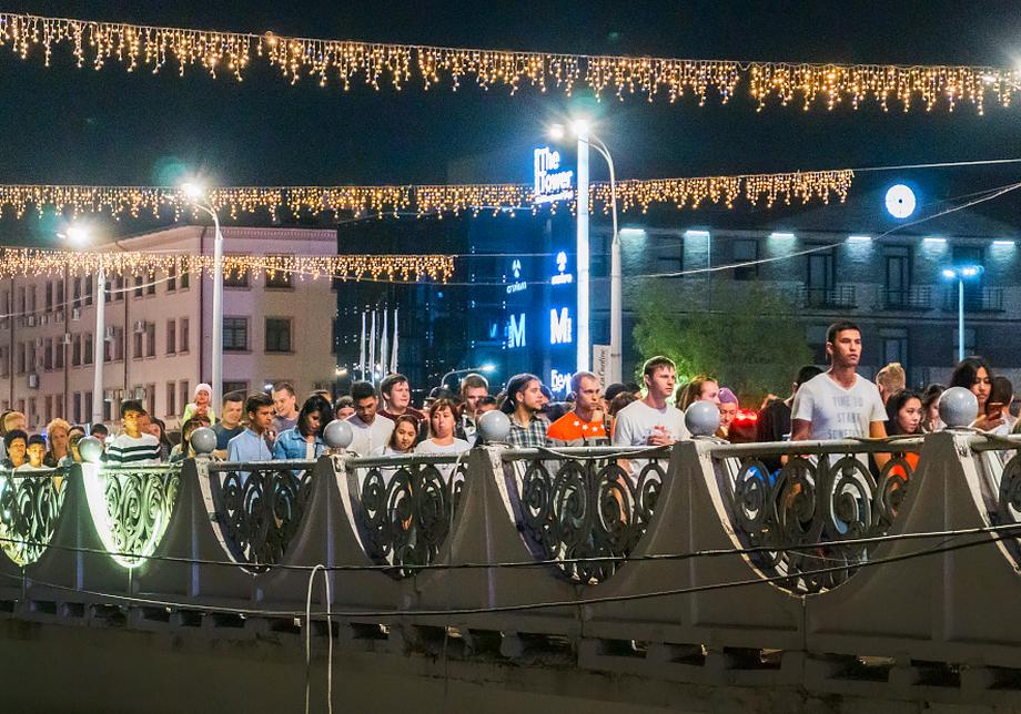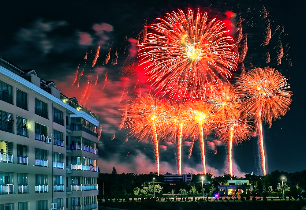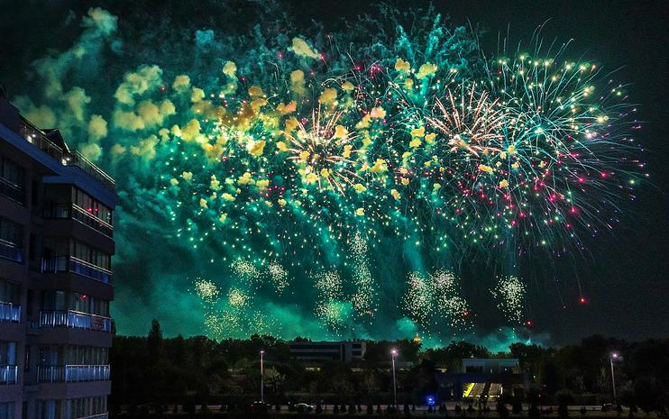 Удобной площадкой для наблюдения салюта оказалась и набережная канала Анхор рядом со строящимся «Сеульским городком» и ТРЦ Next. Отсюда можно было увидеть, как огненное шоу в небе образует геометрические и цветовые композиции, перетекающие одна в другую в волнообразном ритме.
