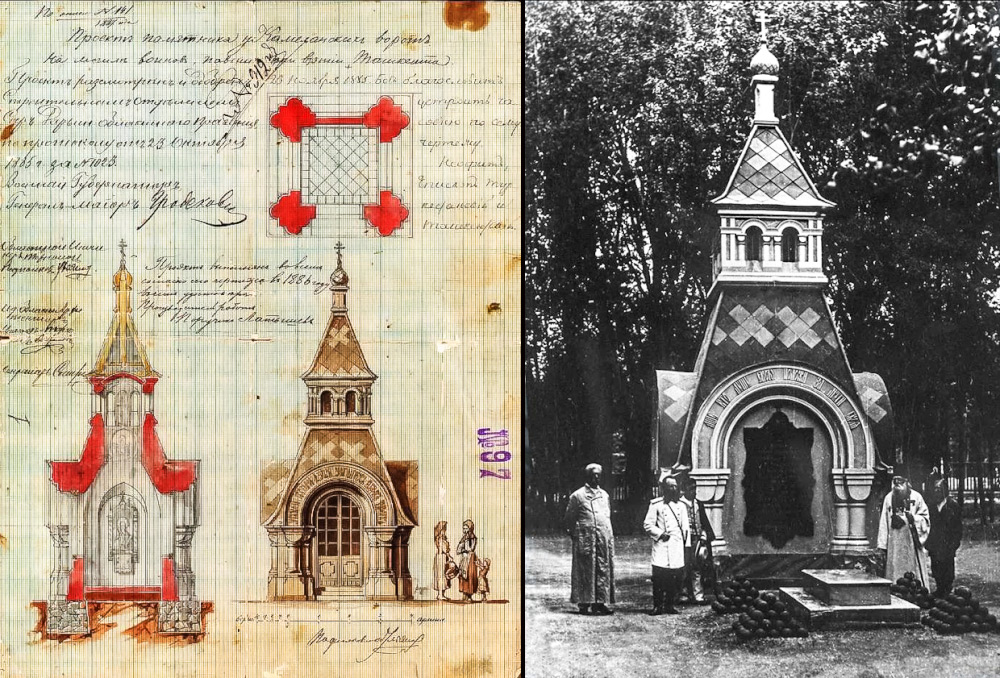 В 1886 году Городская дума Ташкента, ставшего к тому моменту столицей Туркестанского генерал-губернаторства, удовлетворила многочисленные ходатайства русских ветеранов: на территории братской могилы разрешили построить часовню, которая была освящена во имя святого Георгия Победоносца. Деньги на часовню собрали благодаря частным пожертвованиям. Позже Священный Синод постановил, чтобы в день взятия Ташкента здесь ежегодно проходил крестный ход. Крестный ход обычно начинался у Военного Спасо-Преображенского собора в центре Ташкента и шел до часовни у Камолонских ворот. После революции 1917 года большевики разрушили собор и разграбили часовню, однако ее прочный кирпичный остов устоял перед погромами.