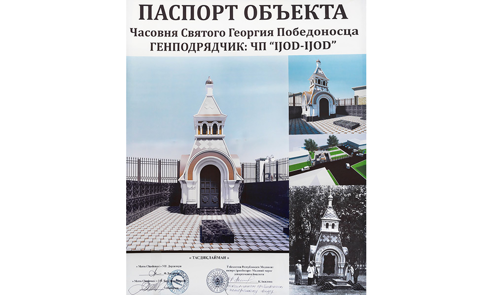 По поручению Кабинета министров и Министерства культуры Республики Узбекистан частное предприятие Ijod-ijod начало работы по реконструкции дореволюционной часовни святого Георгия Победоносца на улице Офтоб в Шейхантахурском районе Ташкента. Часовня была построена в 1886 году над братской могилой 24 солдат, которые погибли 15 июня 1865 года при взятии города генералом Михаилом Черняевым.
