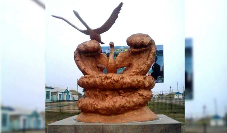 Не менее удивительным оказался памятник, установленный в Западно-Казахстанской области к 25-летию независимости Казахстана. О нем писал журналист из Уральска Багдад Измагамбет. Скульптура появилась в Акжайыкском районе. В ней угадываются очертания двух птиц (и это все, что в ней можно было угадать).