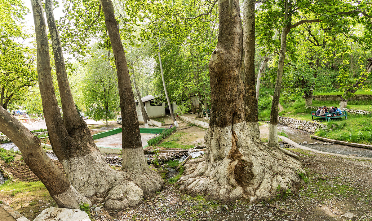Окрестности мавзолея Хазрата Башира и сегодня наводят людей на мысли о покое, влекут к уединению и созерцанию. Склоны Туркестанского хребта к югу от перевала Тахта-Карача состоят из причудливых россыпей разноцветных скал. Вода, ветер и перепады температур за тысячелетия придали этим скалам самые необычные формы — они похожи на фантастические каменные скульптуры. Здесь также можно найти десятки глубоких пещер и множество чистых минеральных источников. В тенистом, заросшем лесом ущелье рядом с усыпальницей святого бьет из земли целебный родник Кара Булак — один из истоков реки Кашкадарьи. Дикий грецкий орех и боярышник здесь соседствуют с исполинскими стволами восточных платанов, которые в Узбекистане называют чинарами. Они особенно почитаемы за свое долголетие. Чинары возрастом в несколько сотен лет прежде украшали многие древние оазисы Центральной Азии. Сейчас, увы, их осталось немного. Верховья реки Кашкадарьи — одно из тех мест, где еще можно увидеть реликтовые рощи дикорастущих чинар. Они стоят по берегам горных ручьев, их могучие корни, обнаженные весенними паводками, рельефно выступают из земли.