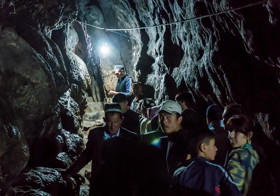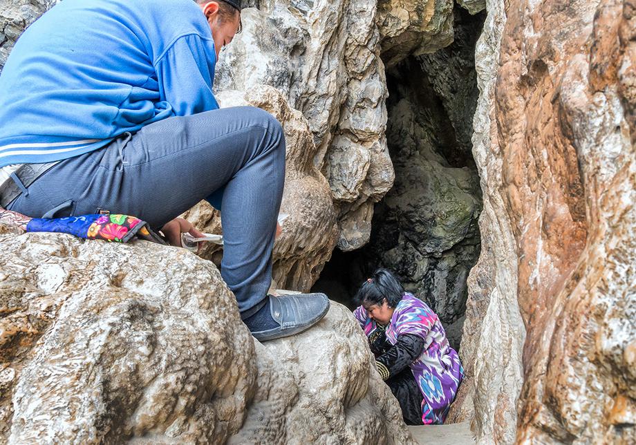 На подходе к каменному гроту паломники обязательно снимают обувь. И дело тут не только в благоговейном отношении к святыне — обувь снимать нужно из соображений безопасности. В холодных недрах пещеры, в самом дальнем ее конце постоянно горит алтарь со свечами. Обычай зажигать свечи на алтаре, чтобы очиститься от грехов, не согласуется с мусульманскими представлениями. По словам гидов, местные жители могли заимствовать его от тех самых огнепоклонников, от которых прятался здесь сам царь Давид. Здешний мулла, совершающий молитвы в пещере, говорит, что Всевышний в его бесконечной милости дает прощение людям, невзирая на их суеверия и предрассудки, поскольку смотрит только на искренность веры. Так уж вышло, что от постоянно горящих свечей все камни и пол пещеры оказались покрыты толстым слоем свечного воска. Он сразу налипает на подошвы, делая возвращение назад крайне рискованным — можно поскользнуться как раз у края 300-метрового обрыва. Именно поэтому в гости к царю Давиду принято заходить босиком.