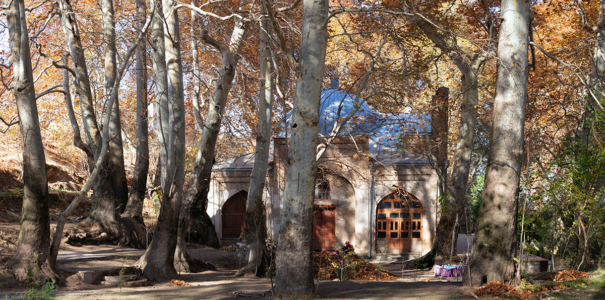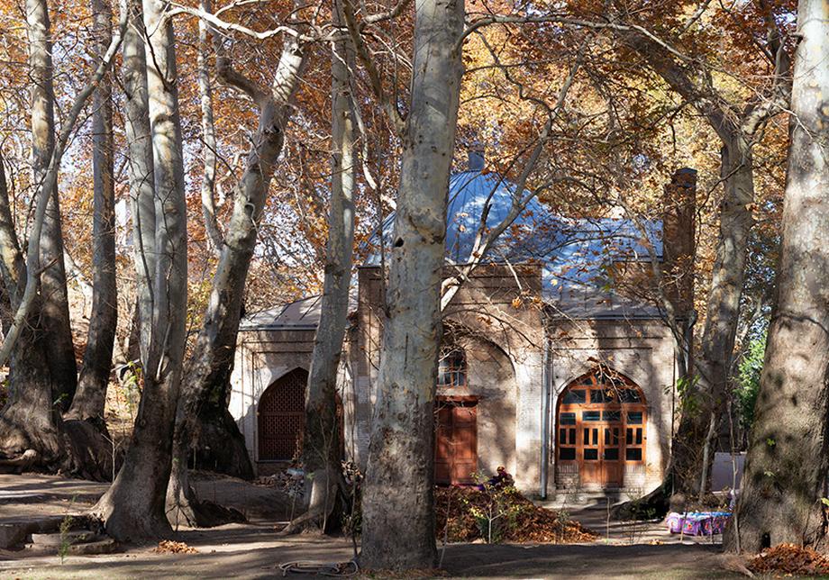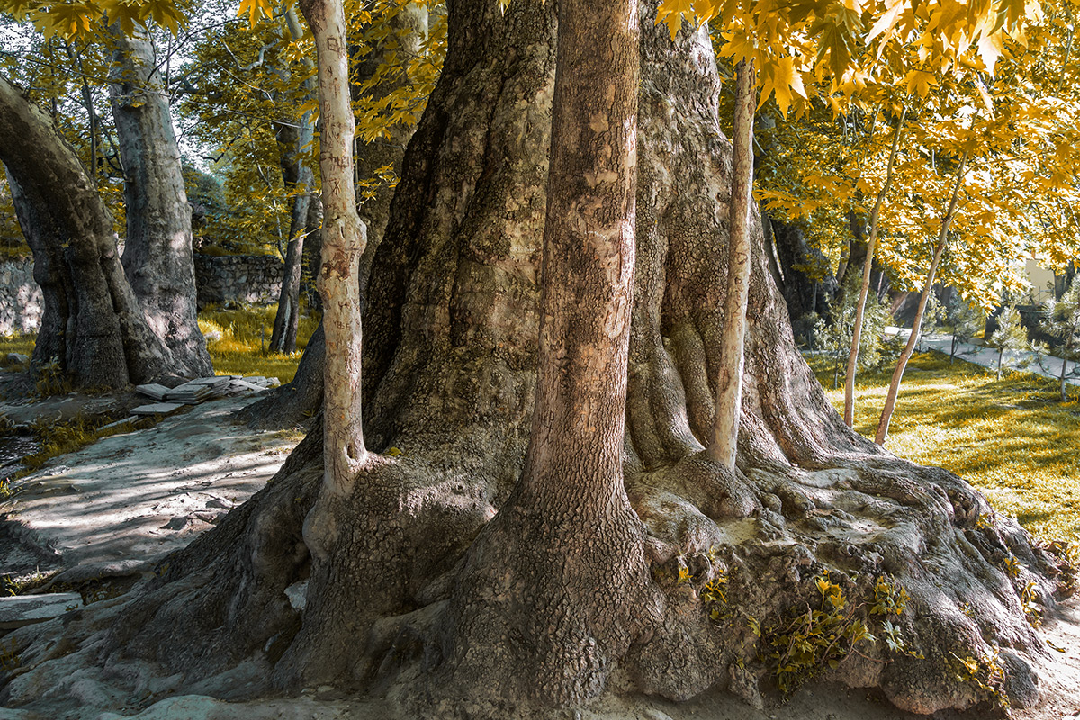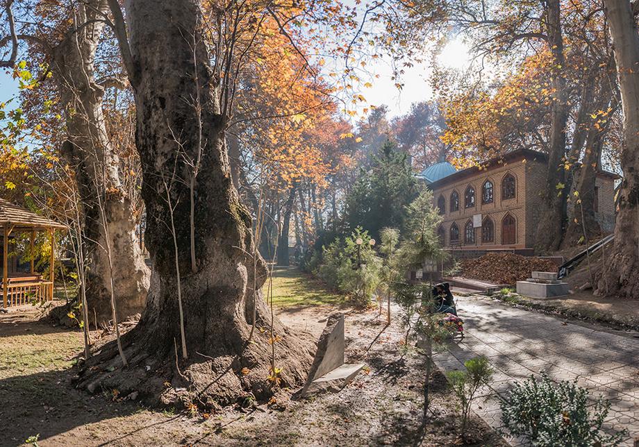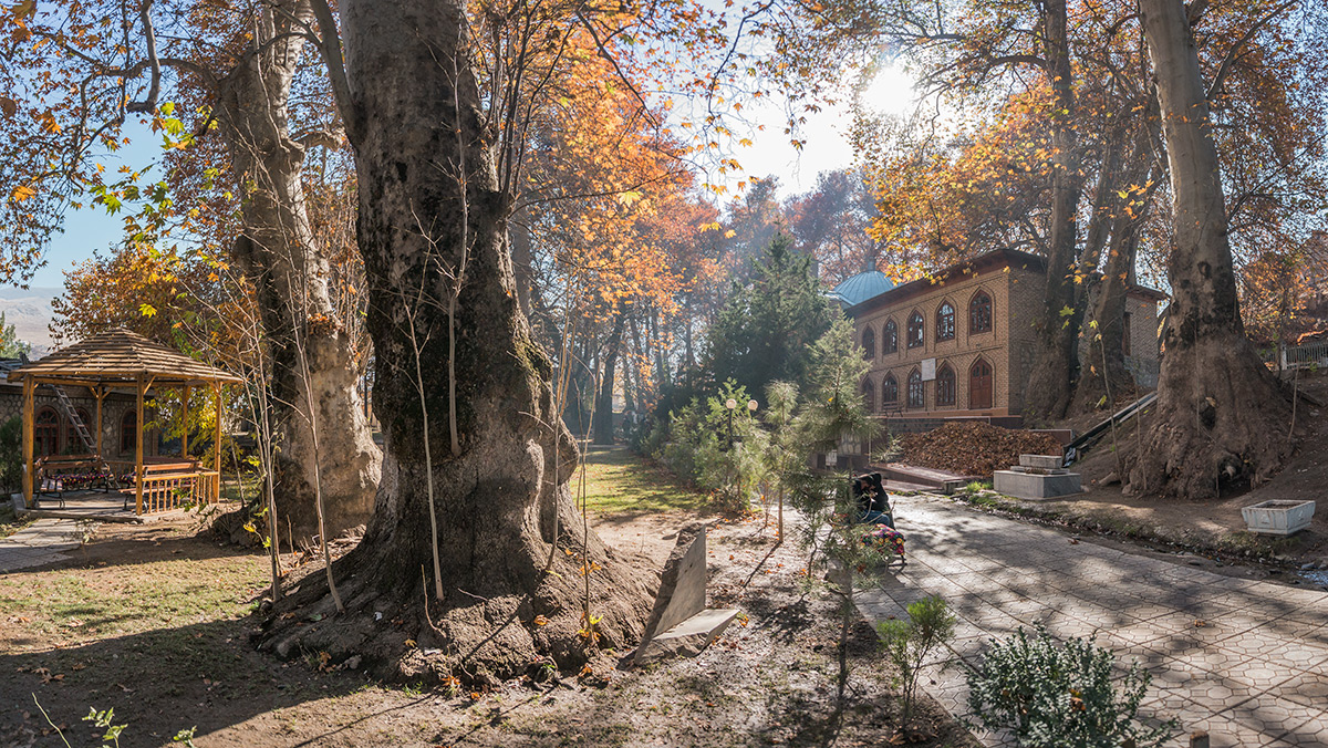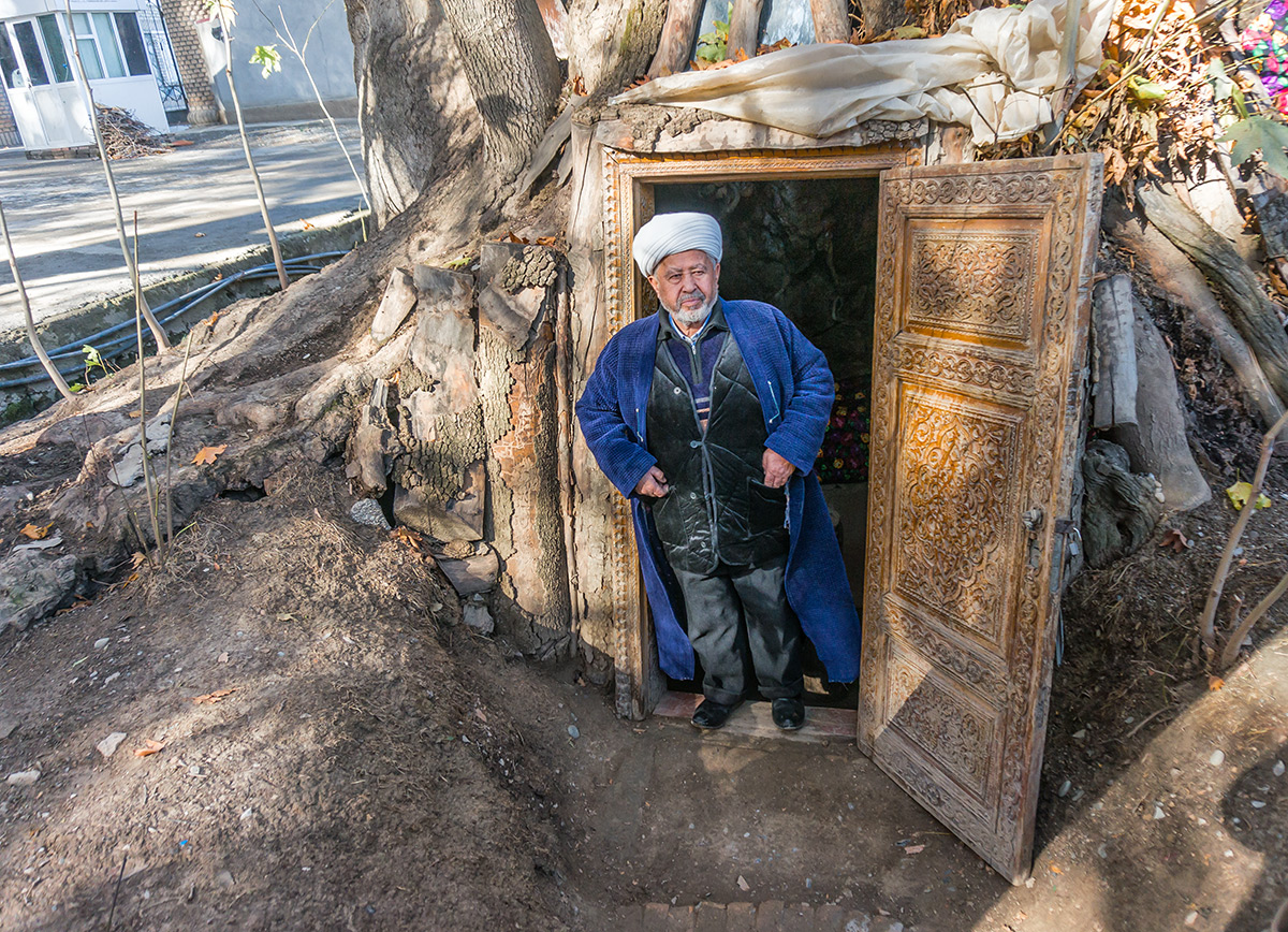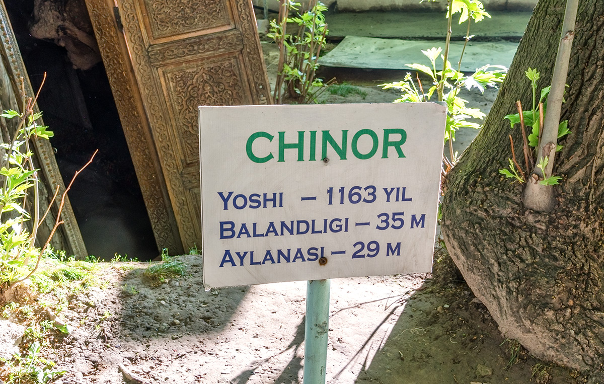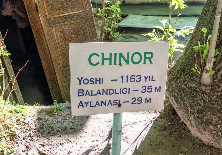 Самая крупная из здешних чинар достигает высоты 35 метров. Под ее корнями образовалась огромное дупло или естественная пещера. Эта удивительная пещера полностью скрыта внутри дерева, основание которого служит ей потолком. Стены пещеры частично укреплены изнутри кирпичной кладкой, а вход снабжен резной дверью с замком. Внутри дерева одновременно может поместиться до десяти человек. Изначально оно, скорее всего, использовалось как чилляхона — место сорокадневного молитвенного уединения суфийских отшельников. Есть легенда, что еще до революции дерево для тайных сходок облюбовали большевики-заговорщики, а во времена СССР в нем было секретное медресе — исламская богословская школа. В народе дерево называется Мактаб-Чинор, то есть дерево-школа.