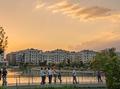 Больше посетителей в вечерних сумерках, когда зажигается иллюминация