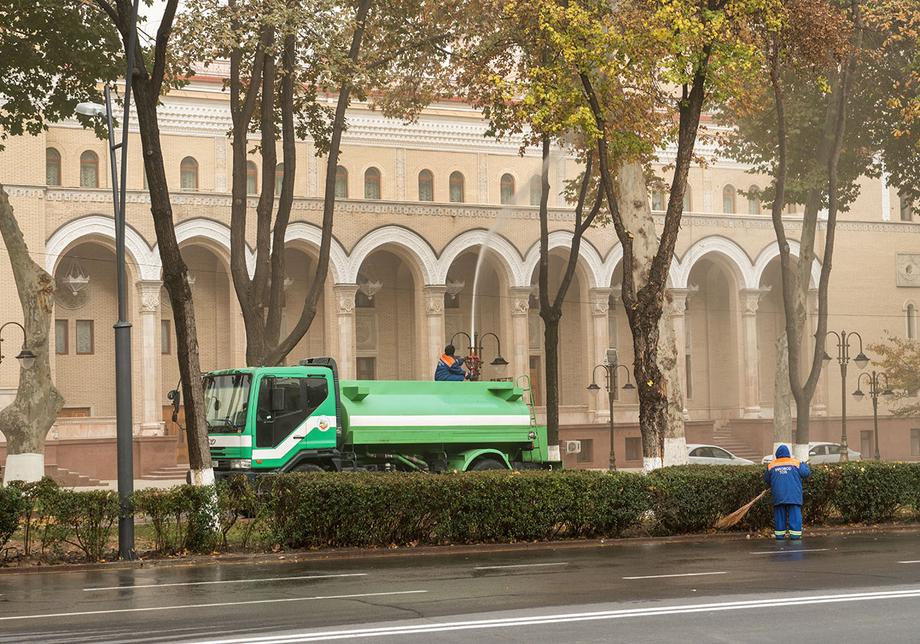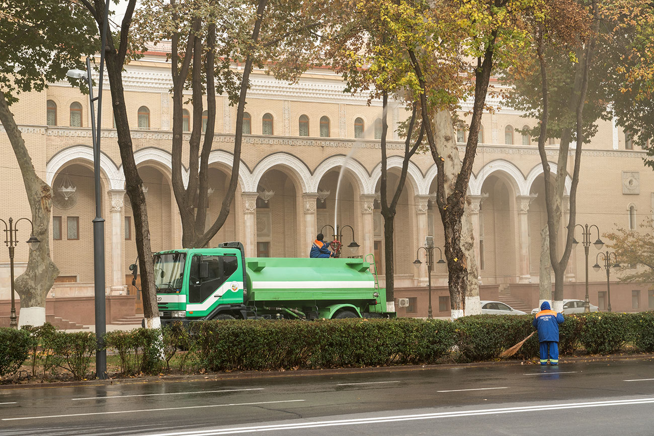 Власти столицы предпринимают меры для того, чтобы снизить количество пыли в воздухе — в центре города кроны деревьев и памятники поливают водой из шлангов.