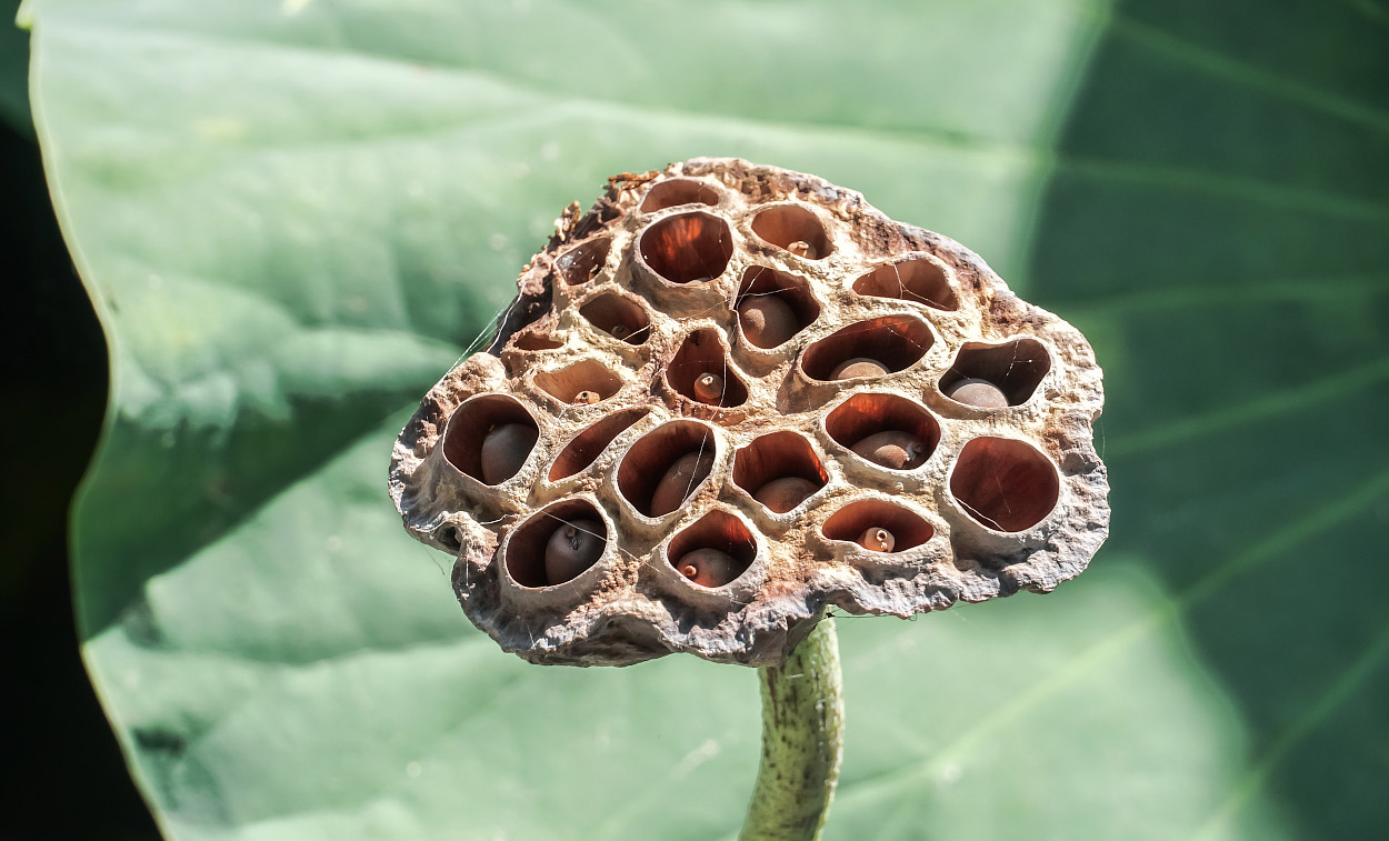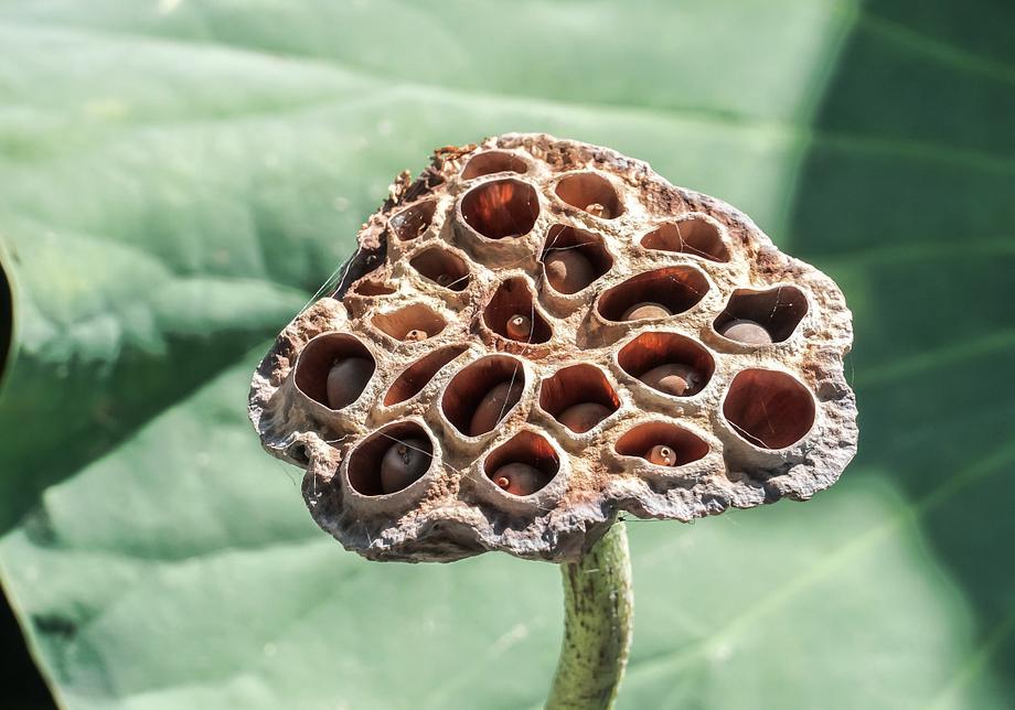 На летнем солнце коробочки лотоса быстро темнеют, становясь похожими на фантастические гнезда гигантских ос. Семена в них тоже становятся твердыми, темными и непригодными для еды. Но это вовсе не значит, что они погибли. Даже пролежав в сухом виде десятки лет и затем попав в подходящие условия — на дно илистого водоема, — они сразу начнут прорастать, и в теплом климате могут дать новый урожай уже через год.