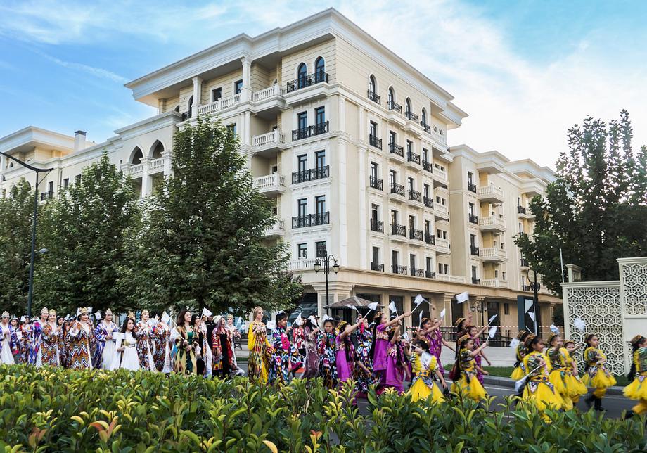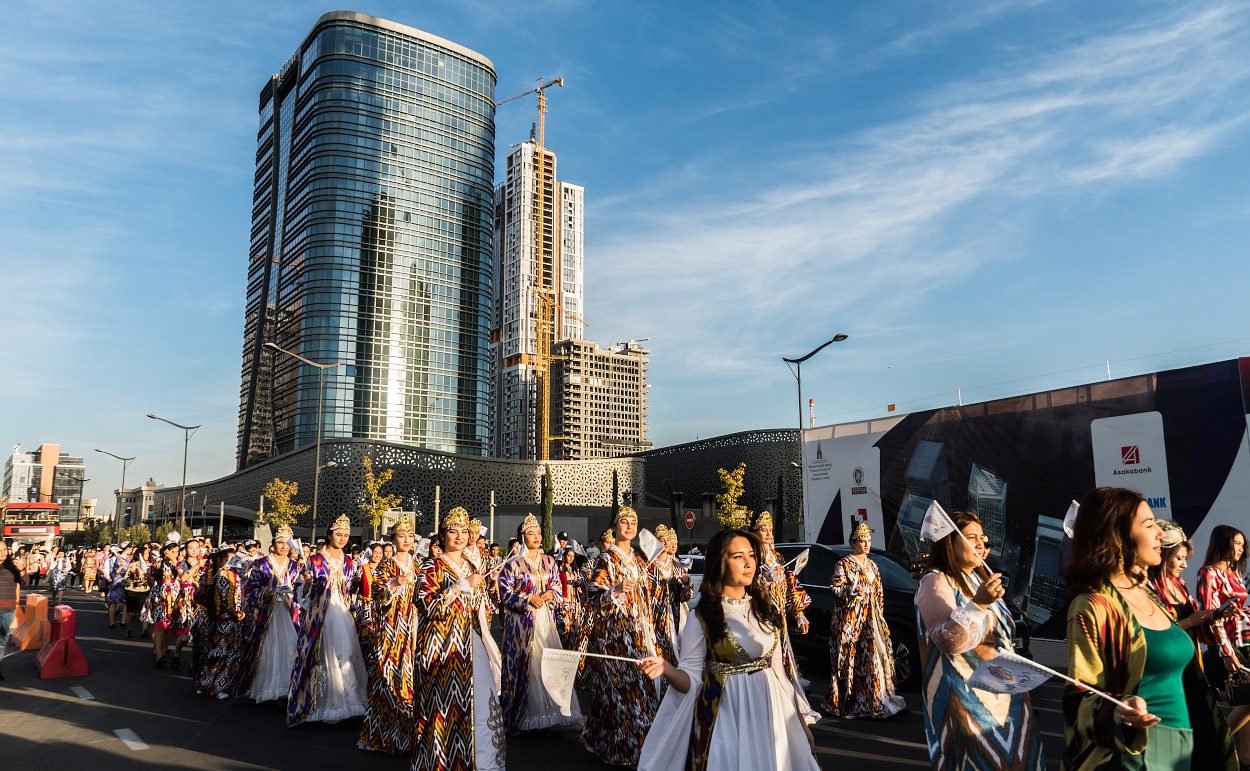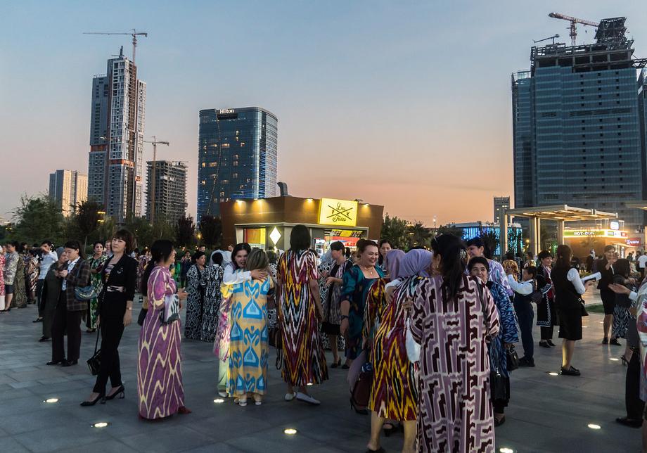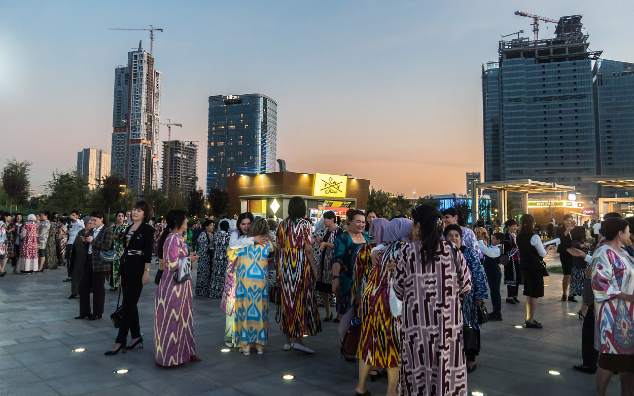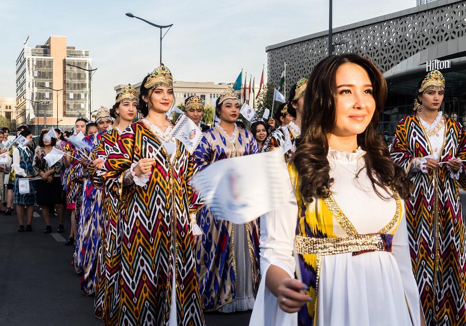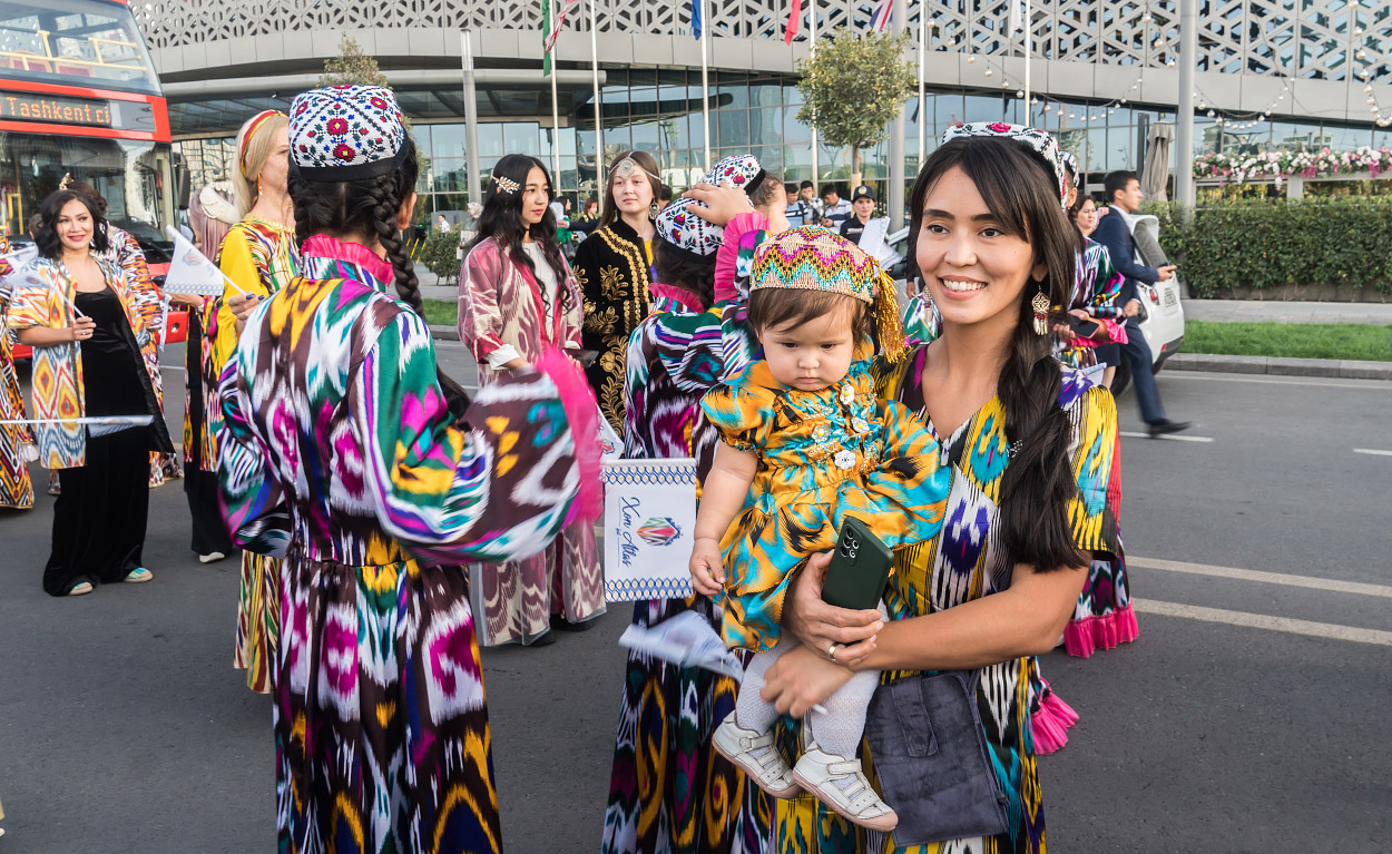 Две сотни жительниц столицы Узбекистана в ярких нарядах из хан-атласа собрались у отеля Hilton и стройными рядами отправились в парад вокруг парка Tashkent City под аккомпанемент национальных инструментов и приветственные крики прохожих.