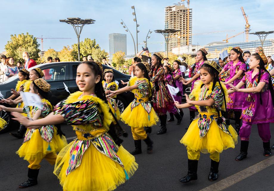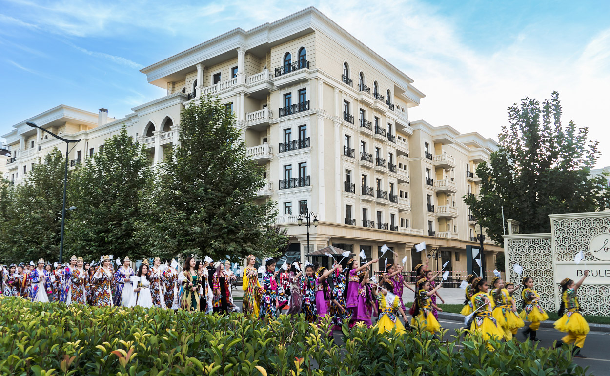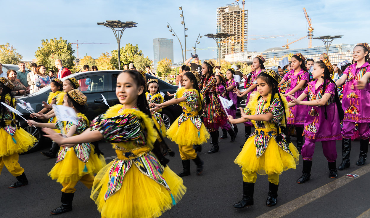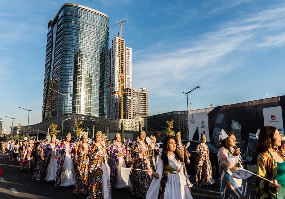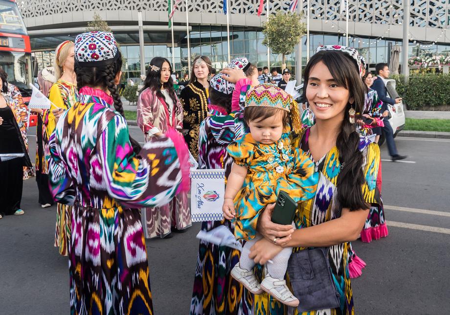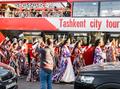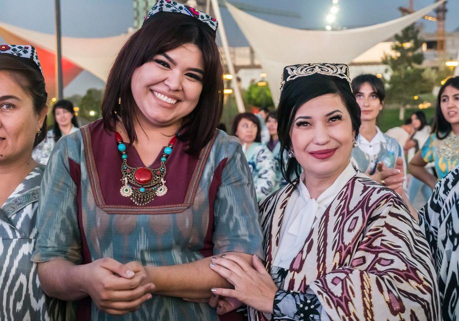 Две сотни жительниц столицы Узбекистана в ярких нарядах из хан-атласа собрались у отеля Hilton и стройными рядами отправились в парад вокруг парка Tashkent City под аккомпанемент национальных инструментов и приветственные крики прохожих.