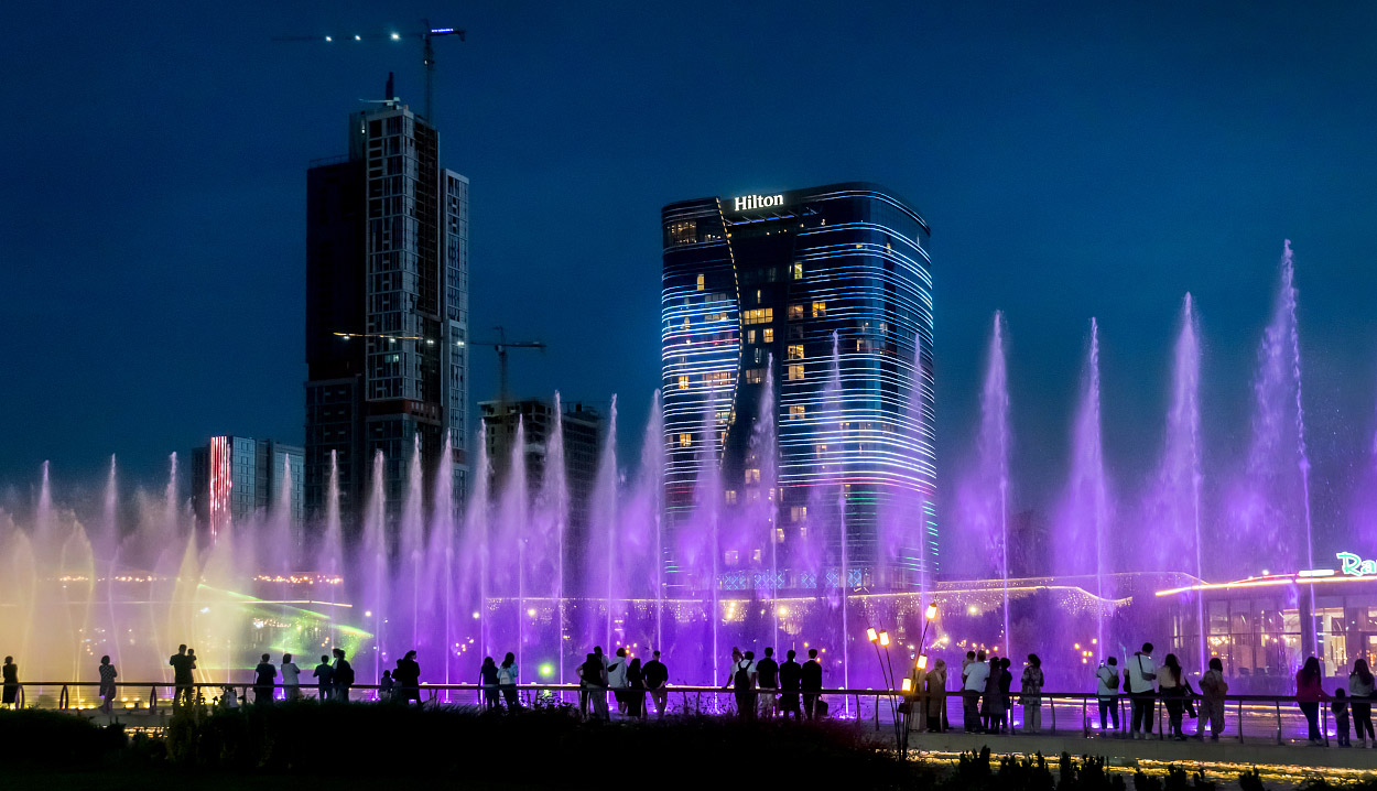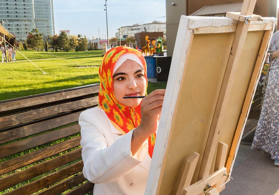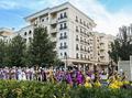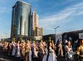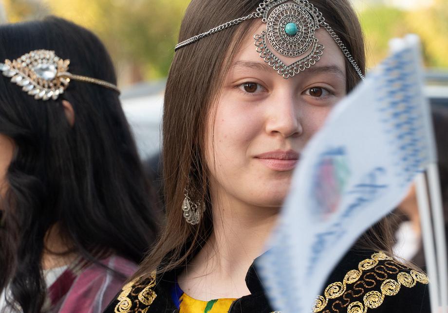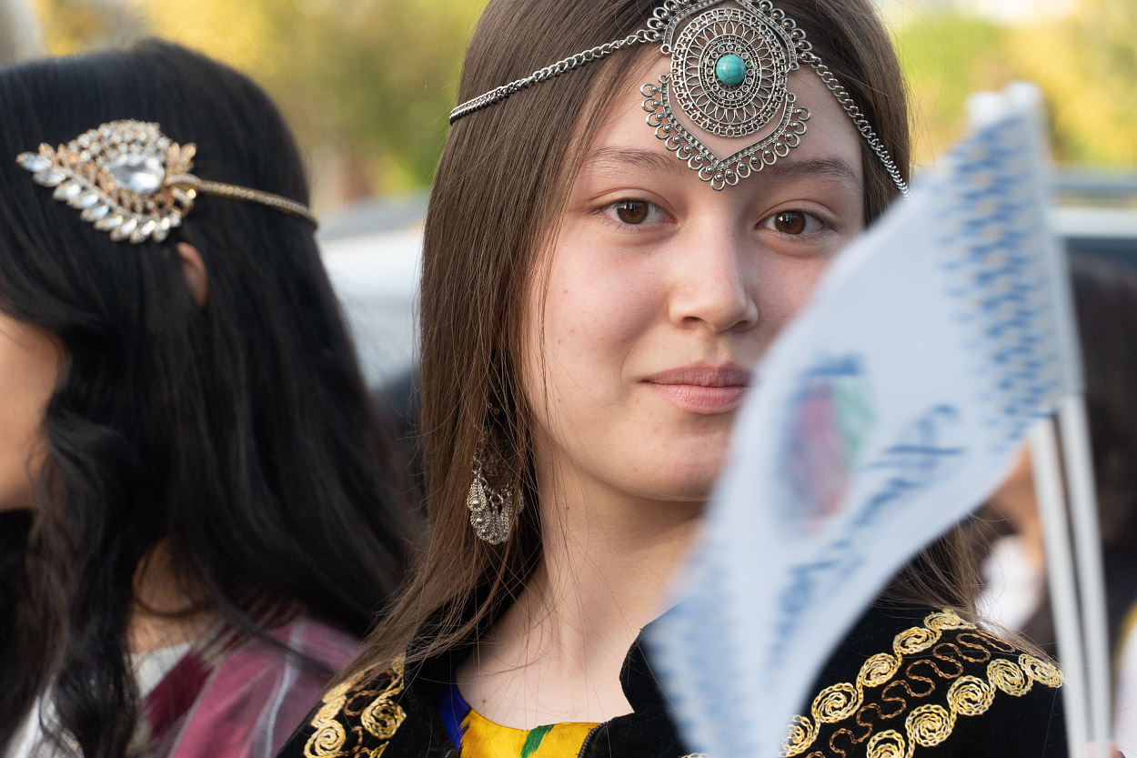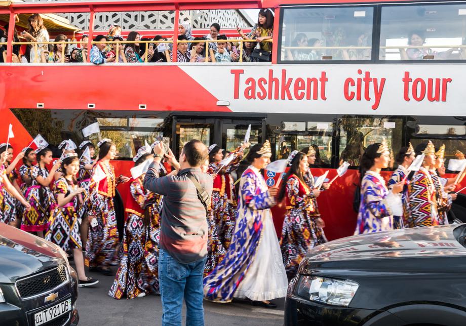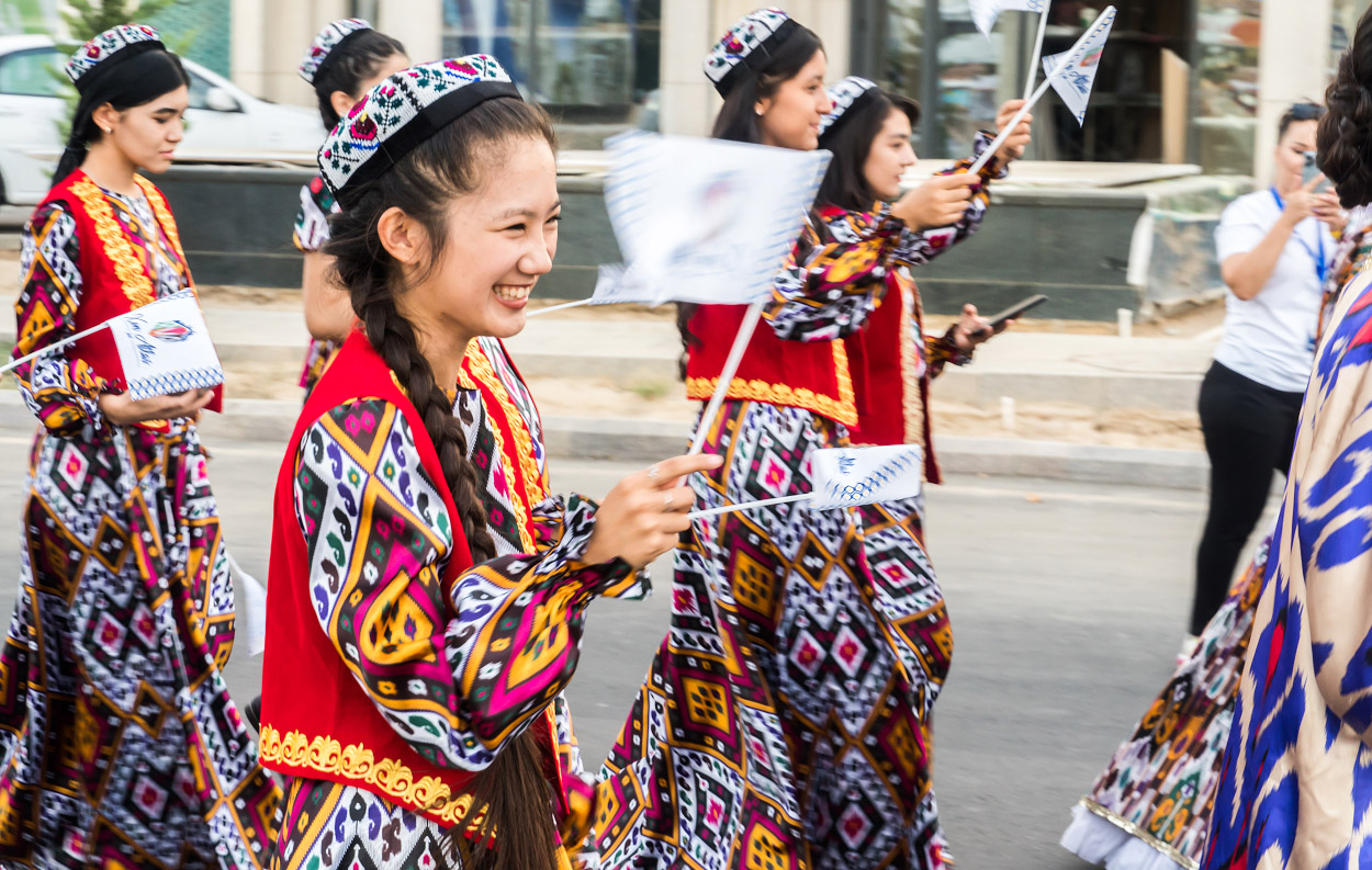 Две сотни жительниц столицы Узбекистана в ярких нарядах из хан-атласа собрались у отеля Hilton и стройными рядами отправились в парад вокруг парка Tashkent City под аккомпанемент национальных инструментов и приветственные крики прохожих.