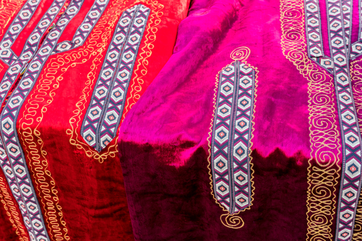 Женские чапаны отличаются немного другим покроем – более приталенные, расклешенные и с укороченными рукавами. Символика традиционных орнаментов тканей не изменилась с глубокой древности до наших дней. Например, плоды граната символизируют молодость, плодородие, изобилие и семейное благополучие. А калампир – стручки красного перца – выступают оберегом от сглаза и прочих дурных влияний.