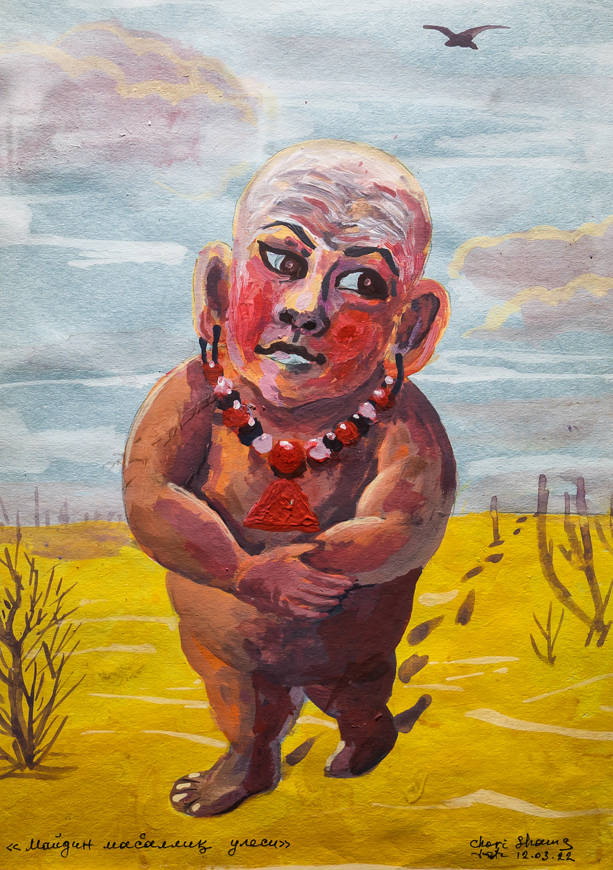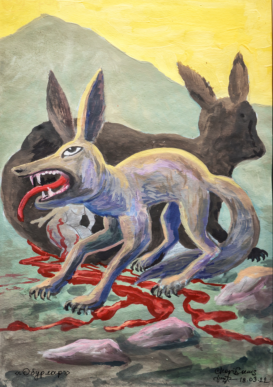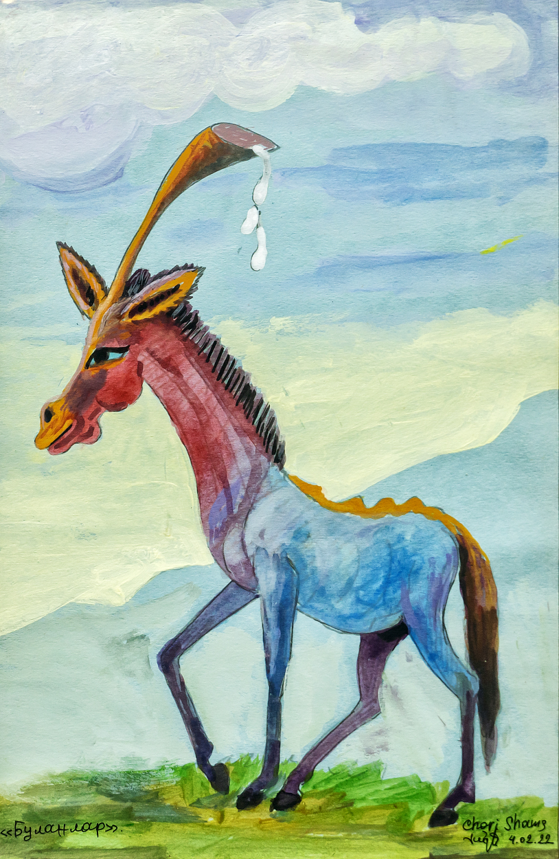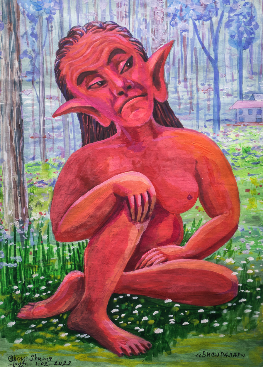 Характерно, что доисламская тюркская мифология особенно интересует художников из Кашкадарьи — обширного региона Узбекистана, где жизнь людей, как и сотни лет назад, близка к природе, и бытовой уклад сохраняет множество древних традиций. Год назад «Фергана» рассказывала об интересном опыте исследования мифологии, предпринятом художником из Китаба Эльнуром Эгамовым. Но в его работах изображался в основном «верхний слой» тенгрианского пантеона — божества и божки древних тюркских небес. А бестиарий его земляков, писателя Шерзода Комила Халила и художника Чори Шамса, рассказывает о множестве других мифологических существ, блуждавших в подсознании предков по его самым отдаленным и мрачным уголкам.