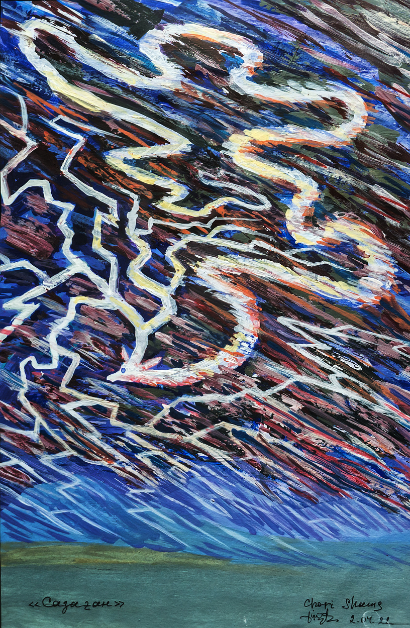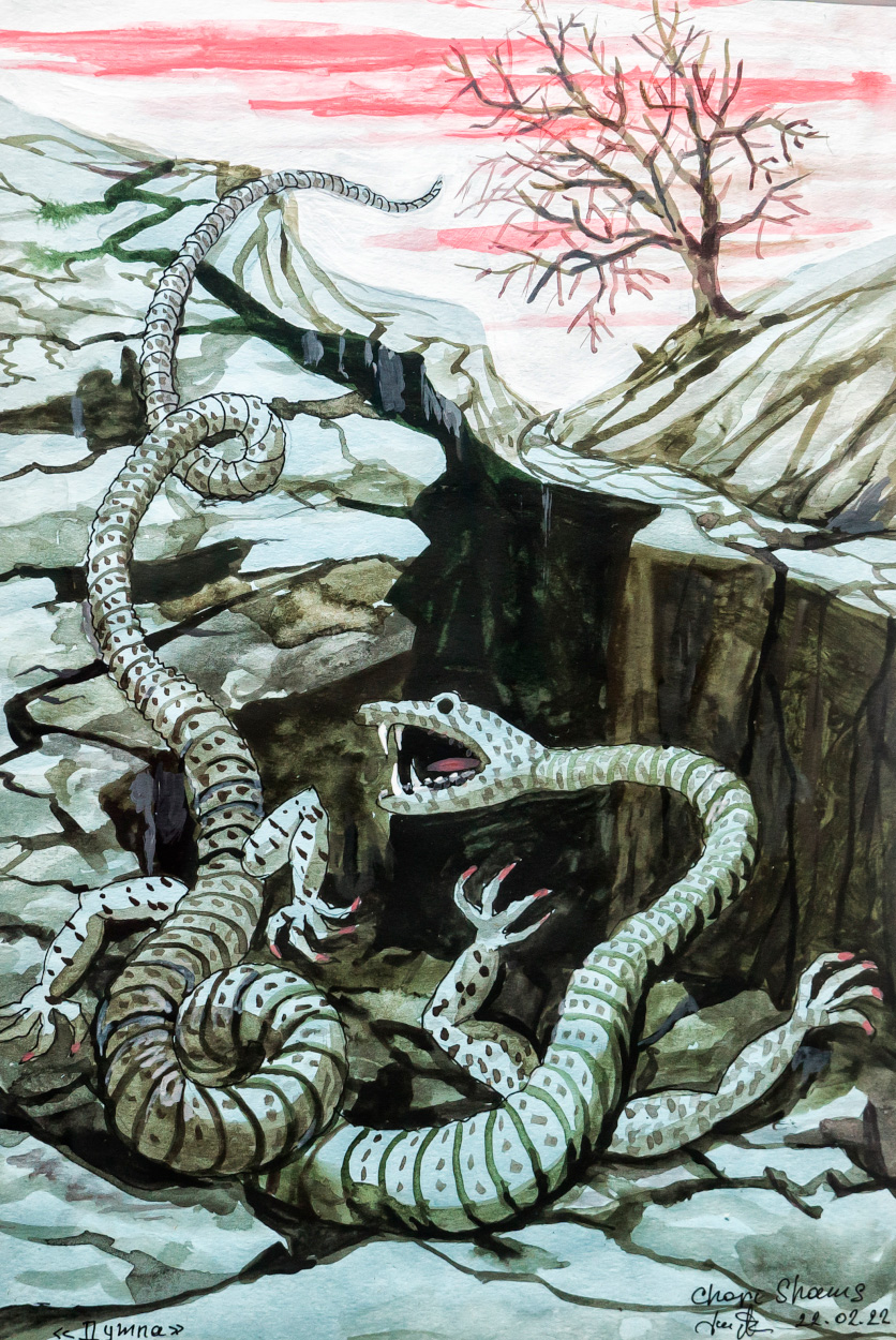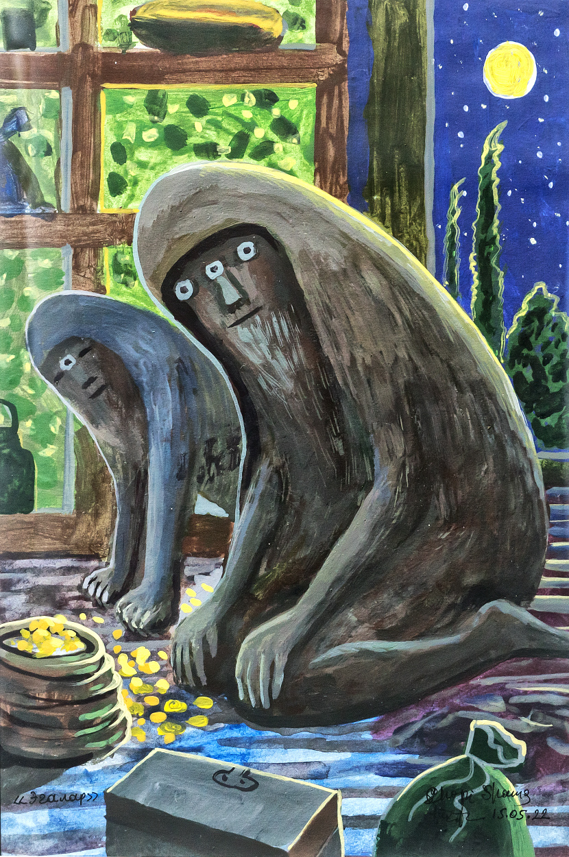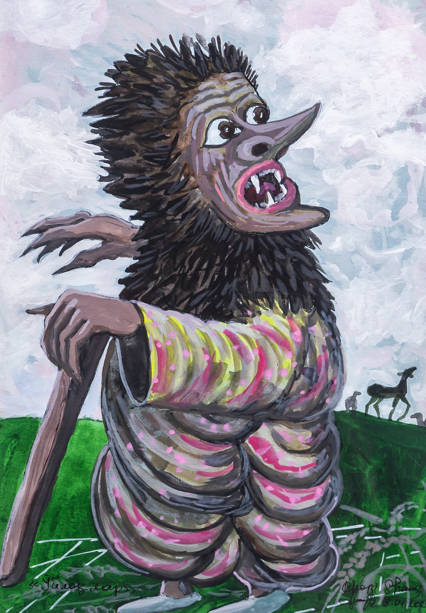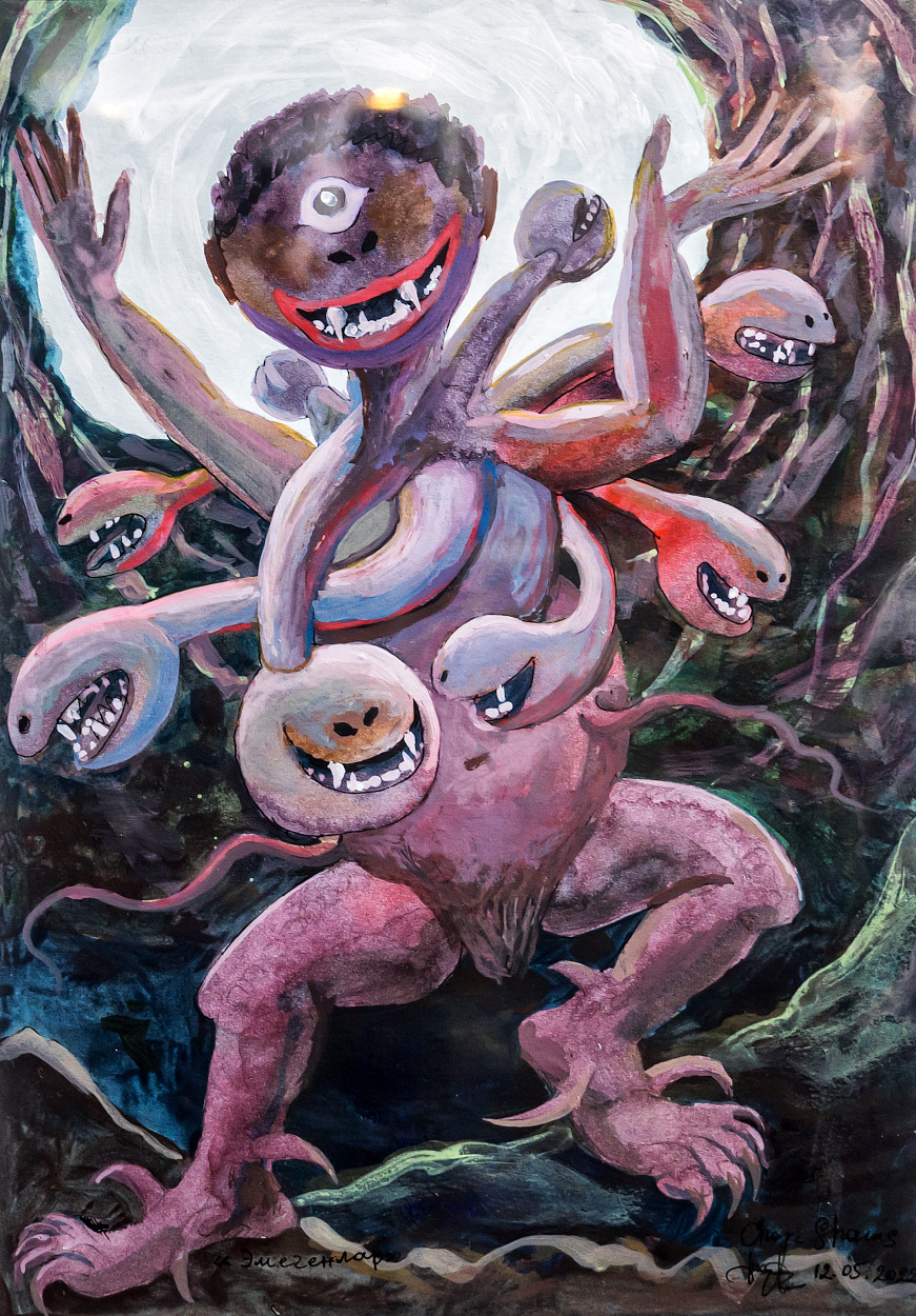 Характерно, что доисламская тюркская мифология особенно интересует художников из Кашкадарьи — обширного региона Узбекистана, где жизнь людей, как и сотни лет назад, близка к природе, и бытовой уклад сохраняет множество древних традиций. Год назад «Фергана» рассказывала об интересном опыте исследования мифологии, предпринятом художником из Китаба Эльнуром Эгамовым. Но в его работах изображался в основном «верхний слой» тенгрианского пантеона — божества и божки древних тюркских небес. А бестиарий его земляков, писателя Шерзода Комила Халила и художника Чори Шамса, рассказывает о множестве других мифологических существ, блуждавших в подсознании предков по его самым отдаленным и мрачным уголкам.